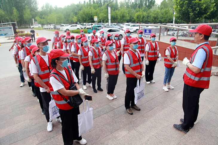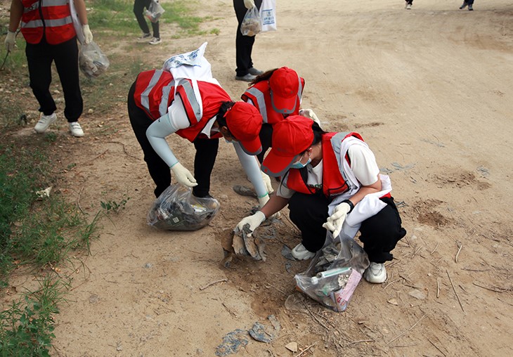 動員講話后,韓書記為各隊長授旗,并帶領大家從市黨群服務中心出發,沿著小徑徒步清理沿途的塑料袋、煙頭等垃圾直至烏海湖畔。當一個個“紅色馬甲”穿梭在樹林、道路,當紅色的黨旗迎著微風飄揚時,一股榮譽感油然而生。