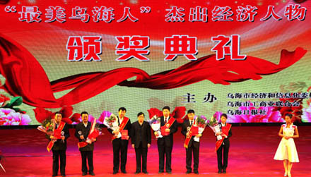 2013年11月22日下午,由市經信委、市工商聯、烏海日報社聯合舉辦的2013年度“最美烏海人•杰出經濟人物”頒獎典禮在海勃灣區青少年宮舉行。市委常委、宣傳部部長王曉平,市人大常委會副主任雍炳煒,副市長林濤,市政協副主席苗耀增出席頒獎典禮并為獲獎者頒獎。
