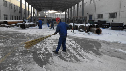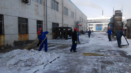 春節過后,氣溫驟降,連續幾天的降雪給廠區內人員、車輛的通行帶來了極大影響。2014年2月7日,烏達化工組織各單位分別開展了義務掃雪勞動。員工們有的用掃帚掃,有的用鐵鍬鏟,還有的用自制的“鏟車”推雪的,大家干勁十足,很快就將廠房周圍及物流通道的積雪清理干凈,美化了廠區環境,也消除了雪天地滑的安全隱患。