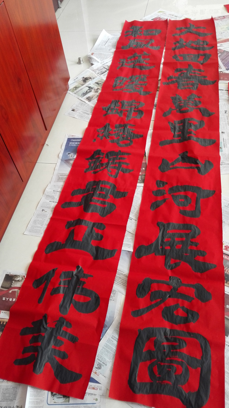 因烏達化工辦公樓門廊高大,購買的春聯一方面尺寸不足,另一方面春聯內容不貼合企業實際。因此,自2015年新春開始,已連續兩年邀請公司工會為化工“量身定做”春聯,公司工會均發揮優良傳統作風,飽蘸筆墨用心書寫,為緊張有序的生產企業帶來了濃厚的文化氣息和新春祝福,為公司工會的暖心舉動點贊!