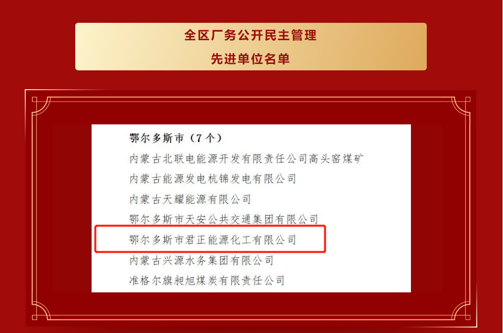 9月1日,鄂爾多斯市總工會發布《喜報!我市多家單位榮獲自治區級廠務公開民主管理先進榮譽》,鄂爾多斯市君正能源化工有限公司獲得“全區廠務公開民主管理先進單位”榮譽。