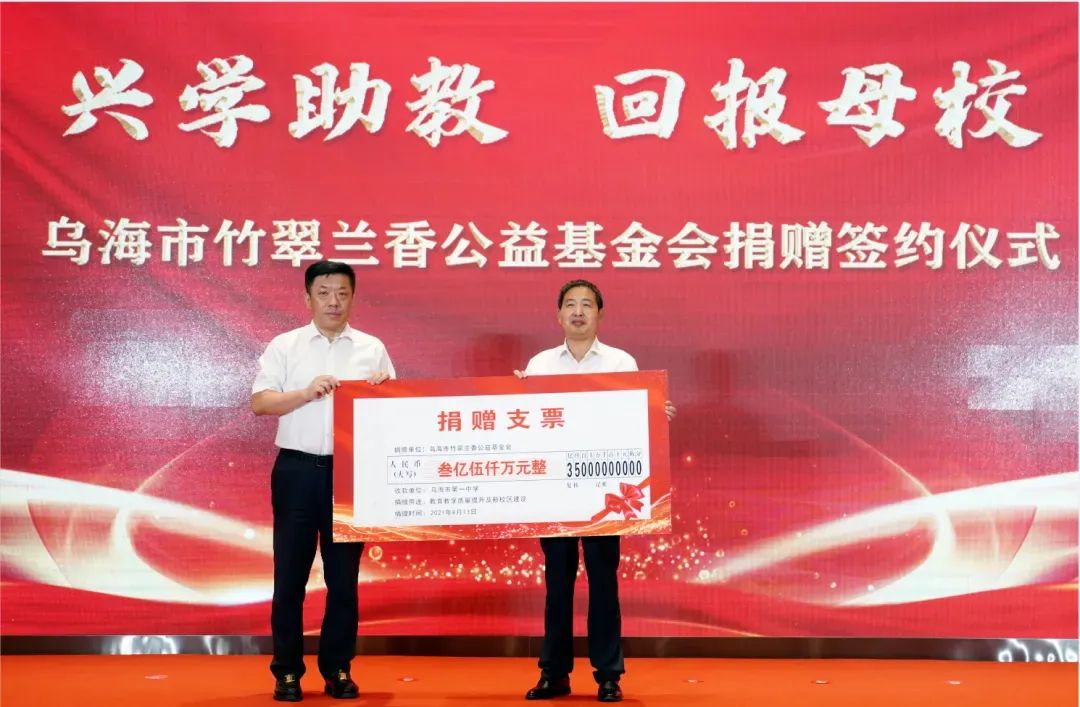 杜江濤先生(左)向烏海一中捐款3.5億元人民幣