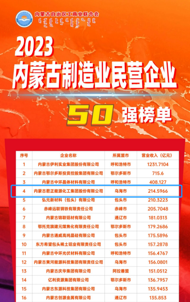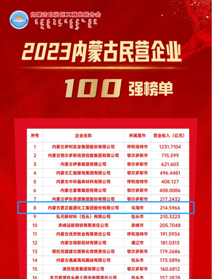 9月25日,2023內蒙古民營企業100強發布會在包頭市舉行。內蒙古君正能源化工集團股份有限公司(君正集團)以214.5966億元營收位列第八。同時登榜“2023內蒙古制造業民營企業50強”,位列第四。